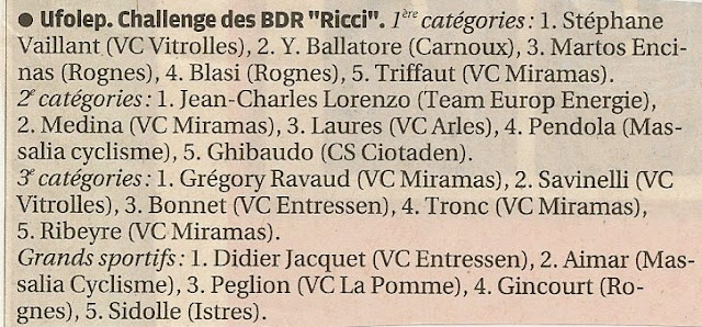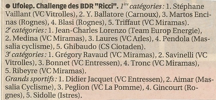 Classement Challenge Ufolep 13 2012 - Johan termine 2ème en 1ère catégorie